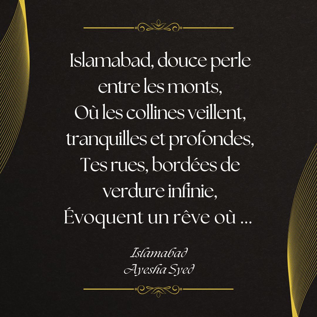 « S’il y a une ville à qui je dois tout pour m’aider à me redécouvrir, c’est Islamabad … une ville unique dans le sens où c’est en pleine nature, il y a des arbres, des fleurs et des montagnes partout … chaque jour, ça vous remonte le moral ! » - Ayesha Syed
