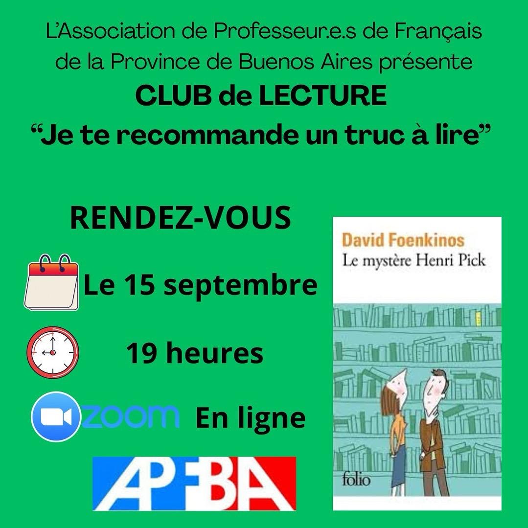 Bonjour! Nouvelle rencontre du club de lecture "Je te recommande un truc à lire" , le 15 septembre à 19 heures en ligne. Le livre choisi:" Le mystère Henri Pick" de David Foenkinos. Inscription obligatoire.