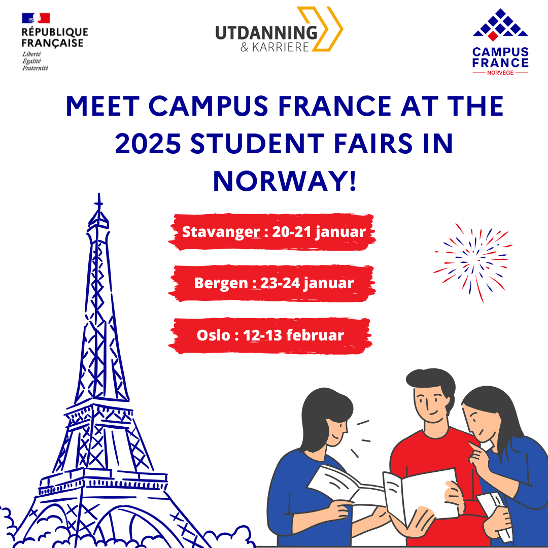 Campus France Norvège se réjouit d'annoncer sa présence au salon de l'étudiant Utdanning & Karriere dans plusieurs villes de Norvège. Cet événement est une occasion unique pour les élèves et étudiants intéressés par un projet de mobilité en France de bénéficier de conseils personnalisés et d'informations sur les opportunités d'études en France.