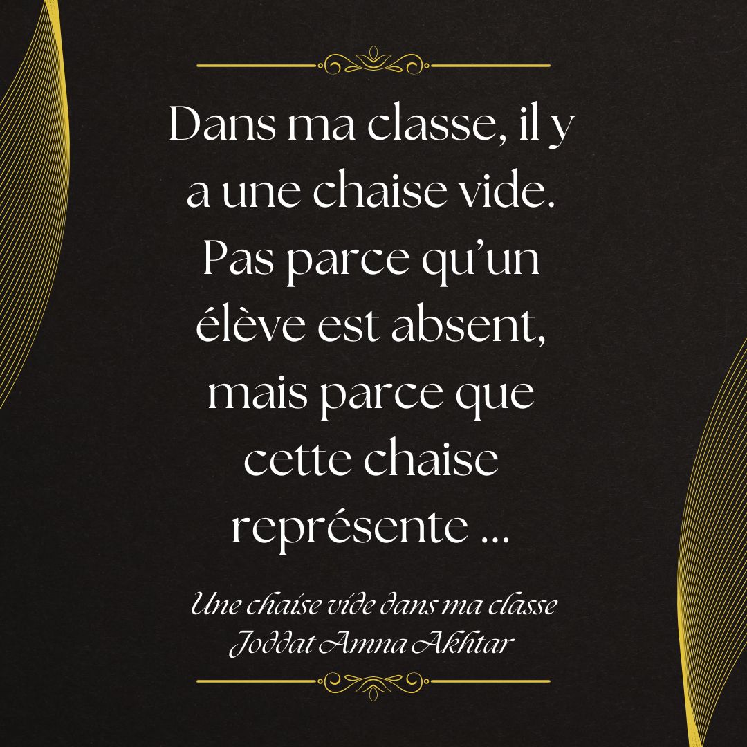 « J’ai été inspirée à utiliser « Une chaise vide dans ma classe » dans mes cours, par l’idée qu’une absence peut transformer l’atmosphère d’une salle de classe. Une chaise vide n’est pas seulement un objet : elle symbolise une voix manquante, une histoire inachevée, un silence qui interpelle. Chaque élève compte, et lorsqu’il n’est pas là, toute la dynamique change. Ce texte est une réflexion sur ce que représente cette absence pour l’enseignant, pour les camarades et pour la communauté de la classe. » - Joddat Amna Akhtar