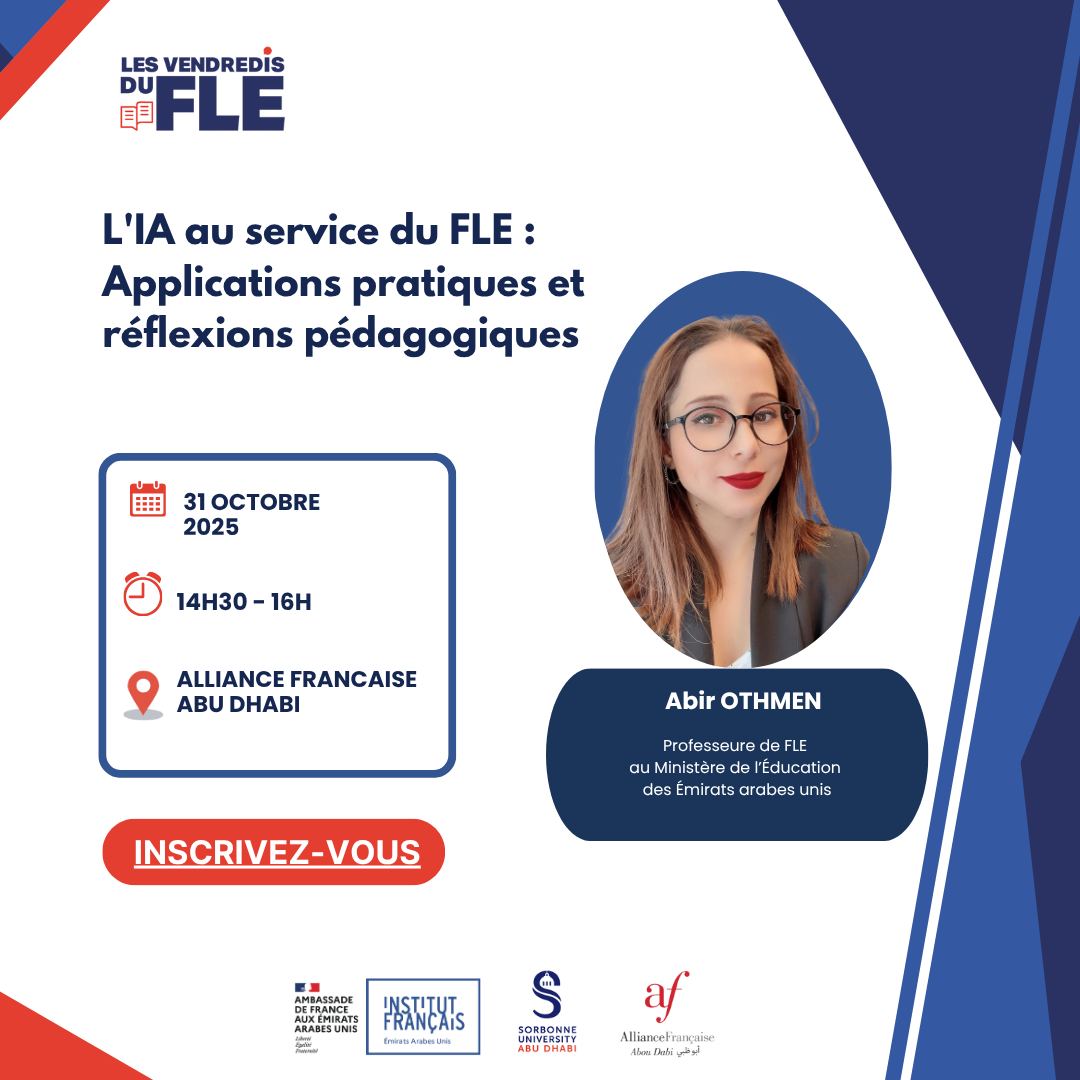 Pour le prochain Vendredi du FLE, retrouvez Abir Othmen pour un atelier sur l'IA et l'enseignement.