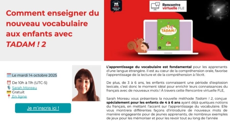 À travers cette Rencontre virtuelle FLE, Sarah Moreau vous présentera la nouvelle méthode Tadam ! 2, conçue spécialement pour les enfants de 4 à 6 ans ayant déjà quelques notions du français, en mettant l’accent sur l’apprentissage du vocabulaire. Elle vous montrera différentes façons d’introduire de nouveaux mots de manière engageante pour de jeunes apprenants, de nombreux exemples de jeux pour les mémoriser et pour les revoir tout au long de l’année.