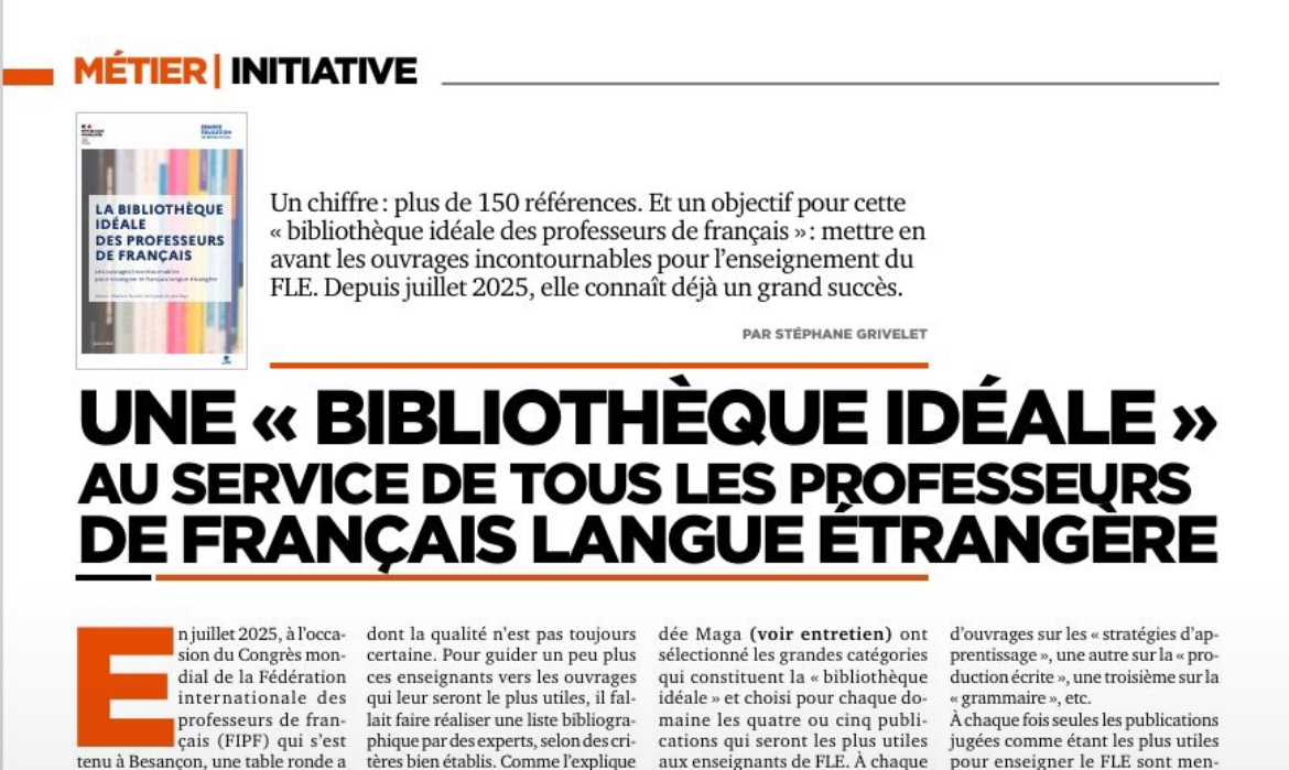 Si vous ne connaissez pas encore la "Bibliothèque idéale des professeurs de français", cet article, paru dans le nouveau numéro de la revue "Le français dans le monde" (fdlm.org), vous permettra d'en savoir plus. Publié en juillet 2025, et créée grâce à un partenariat entre la FIPF (fédération internationale des professeurs de français) et FEI (France éducation international), ce livret permet de connaître les ouvrages essentiel pour l'enseignement du FLE. Avec plus de 10 000 téléchargements depuis son lancement, cette "bibliothèque" est déjà un grand succès. Le téléchargement est gratuit et se fait sur le lien suivant : https://lnkd.in/eaJnBhXp