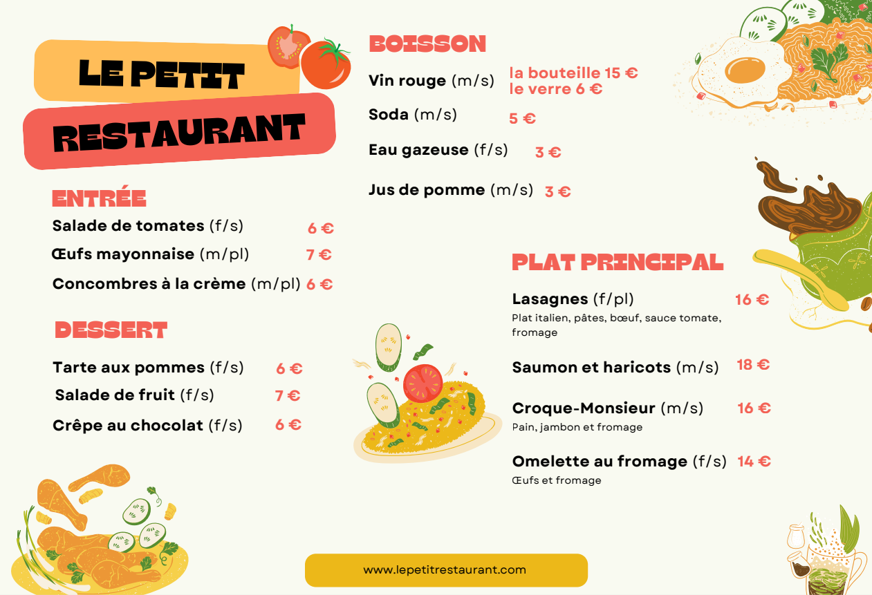 - Employer et comprendre le lexique du restaurant : plats, boissons, menu, addition, serveur, entrée/plat/dessert