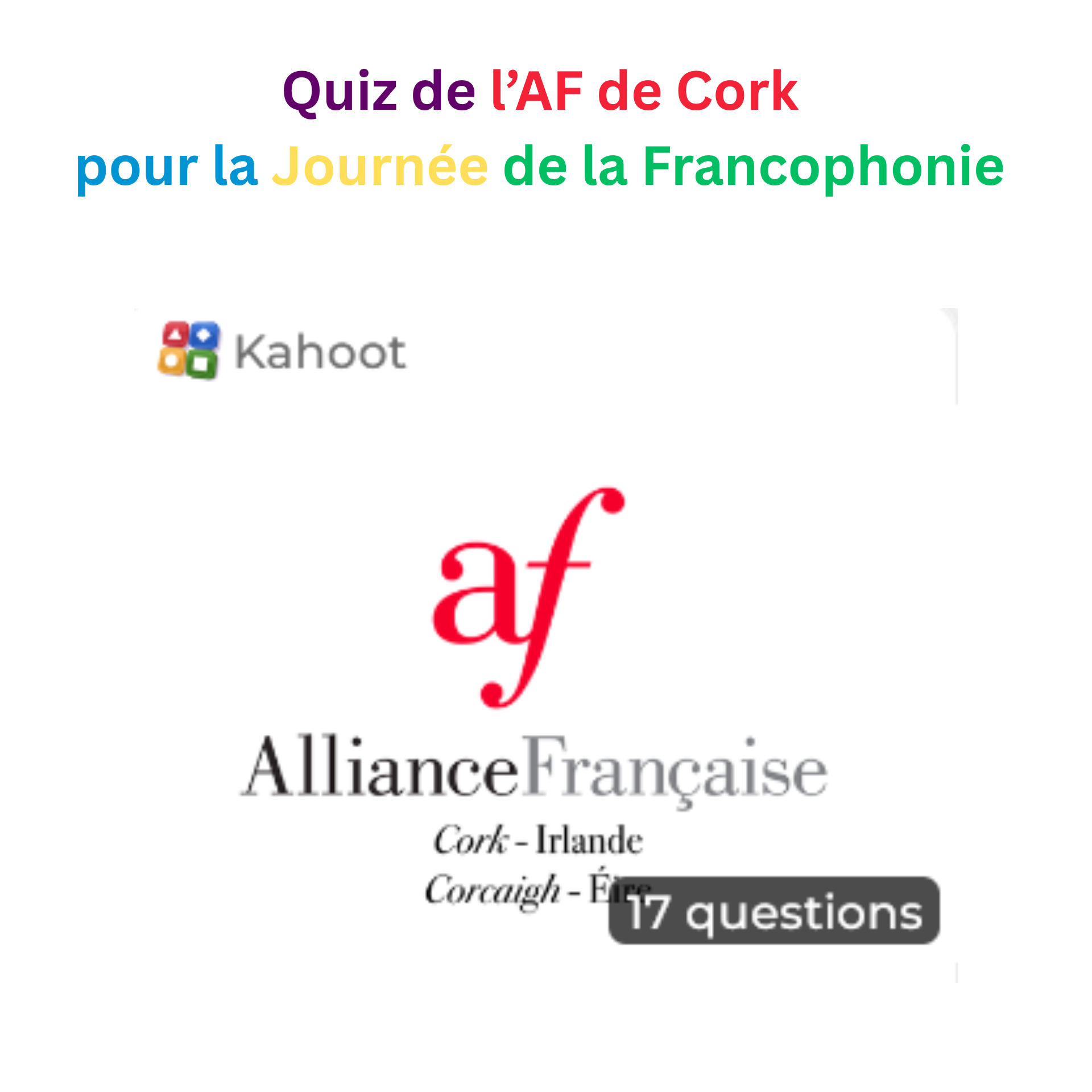 Quiz en ligne (défi Kahoot) sur le thème de la Francophonie créé par l'Alliance Francaise de Cork. Ouvert jusqu'au 22 mars 2026.