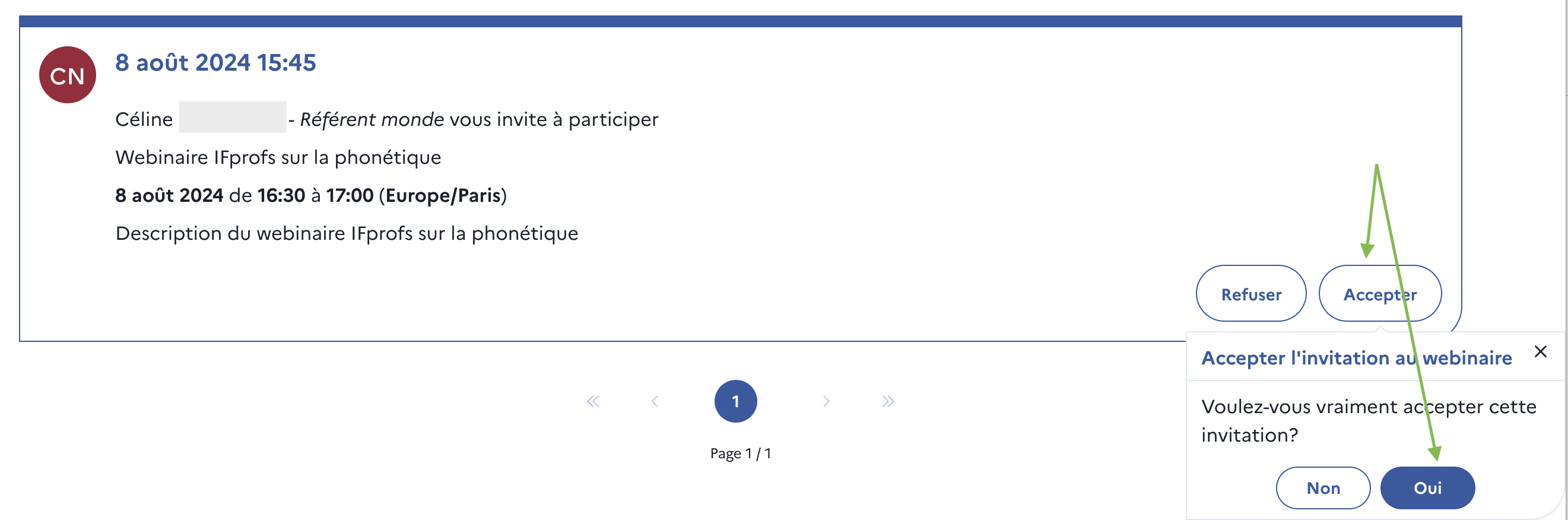 Puis, pour accepter l’invitation, cliquer sur le bouton “Accepter” et confirmer en cliquant sur le bouton "Oui".